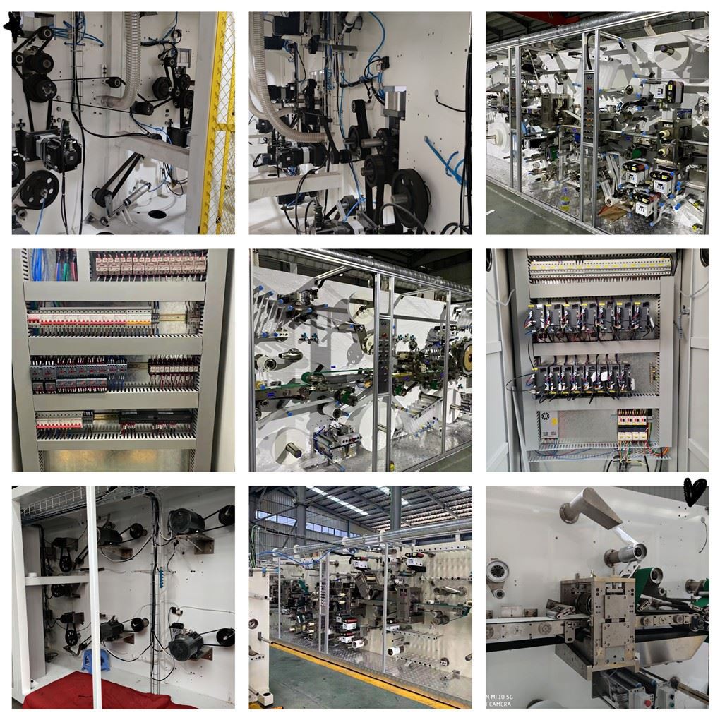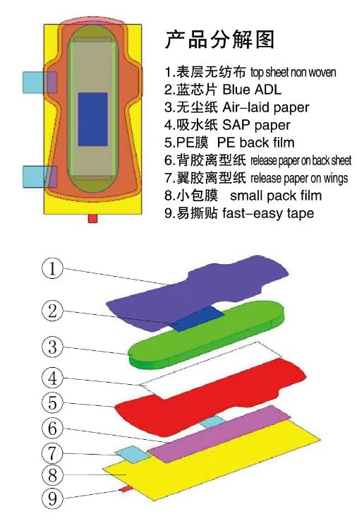 (1)نوع خمیر: لایه سطحی+ADL+هسته پنبهای (کاغذ بافت+خمیر+SAP)+فیلم PE+مرکز کاغذ آزاد+کاغذ آزاد دو طرف+فیلم بسته بندی+چسب ذوب داغ+نوار